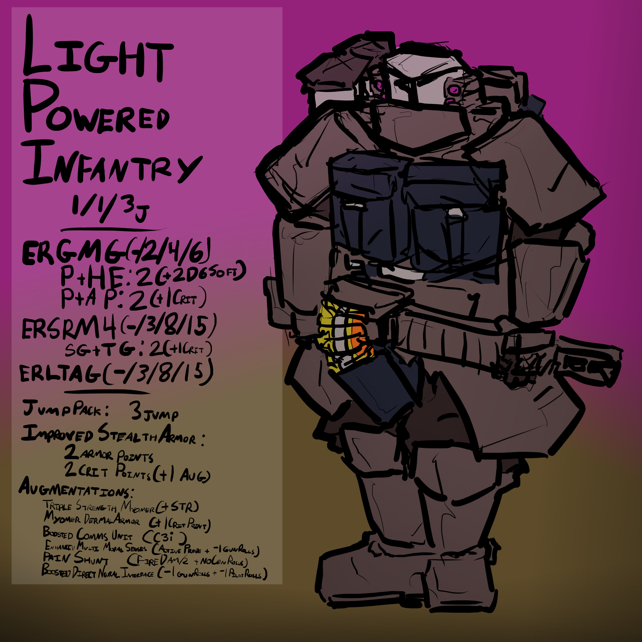 Light Cybernetic Powered Infantry. These are the guys I use for Urban Fighting or even in Marine Operations between Dropships. Based on P.A.L. Battle Armor construction rules and my current campaign, I build enough to outfit enough squads for a platoon and use them as a platoon sized unit.
